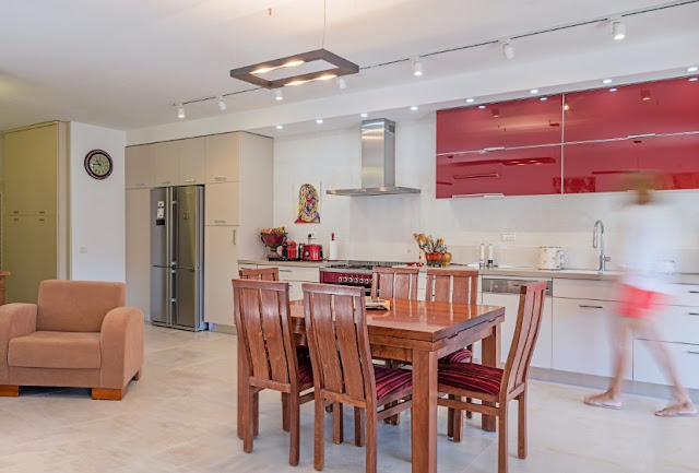 שימו לב למבטח הבא. הוא חלק אינטגראלי עם הסלון, כמו רוב המטבחים היום. אבל, הוא תוכנן בצורה כזאת, שמה שרואים מהסלון - זה רק האי ואזורי האחסון. כל אזורי העבודה נמצאים בצד ימין מאחורי הקיר ובלתי נראים. אני חייבת לומר שפינת האוכל הזאת ממש לא מתאימה כאן, בעיני. היא גורמת לחלל הזה להראות כמו חדר ישיבות.